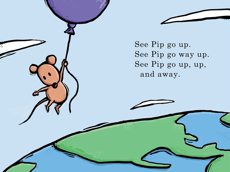From the Ready-to-Read series that includes See Otto (2002) and Ride Otto Ride! (2002), this very simple book introduces a little mouse named Pip. "See Pip. See Pip point" begins the text. When Pip sees Otto's purple helium balloon, he points at it repeatedly until Otto politely hands it over. The balloon quickly lifts lightweight Pip into the air. A bee accidentally runs into the balloon and pops it, but Otto flies by in a clunky wooden airplane and saves Pip. Unfortunately, the plane crashes into a tree, and Otto and Pip splash into a pond beside a couple of hippos. The little one holds a red balloon. "See Pip point" the text concludes, implying a continuing story beyond the last page. The illustrations, large in scale and clearly delineated against white backgrounds, feature particularly expressive characters. Using a very few short words, plenty of action, and droll humor, Milgrim creates a book that even beginners will enjoy reading. Read-aloud fun for those not ready to read, too.