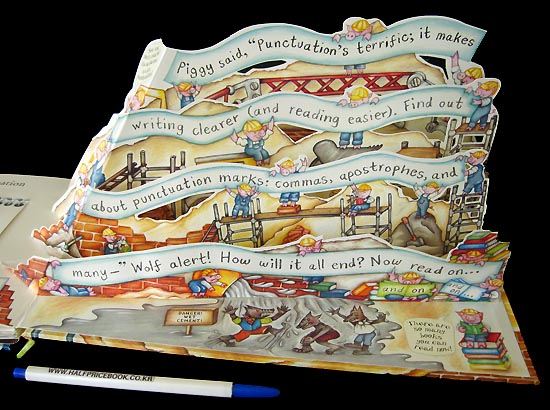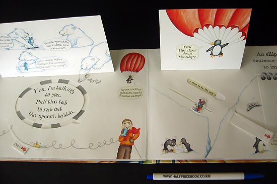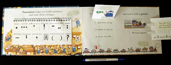 Filled with informative tabs, lift-the-flaps, and pop-ups, this highly interactive book acts as a giant grammar lesson. Readers will learn the proper use for commas, semicolons, colons, exclamation points, dashes, and more. The text is funny as well; for example, the section called comma jokes shows how commas change the meaning of sentences: Lets eat the kids begged Mom becomes 'Lets eat, the kids begged Mom. Children will enjoy this book, though its engineering design makes it delicate for heavy circulation. Consider a copy for reference or classroom use. |