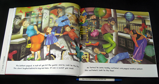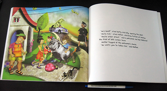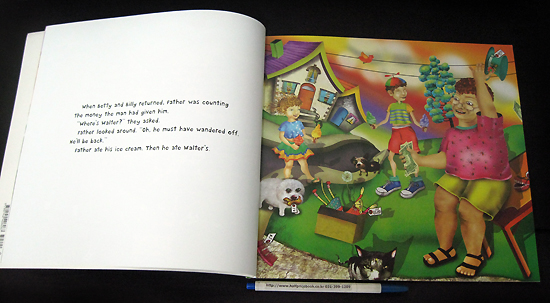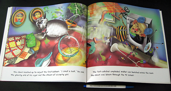 In this second far-fetched tale about Walter, neighbors have been avoiding the yard-sale table where Walter has been sitting all day. Unbelievably, Father wonders why! Yet he doesn't hesitate to sell the pup to the first man who stops by to inquire. The new owner, a clown, intends to use Walter for a bank heist by fastening him to a "fart-catcher" in order to inflate balloons with his obnoxious-smelling gas. As the clown pops the balloons in the bank, customers and bank tellers are overcome with the stench. When the perp arrives home with the sack of money, he lights a cigar and is launched across the room because of a gas leak. Walter runs out the door toward his former home, and the police follow the trail of $100 bills fluttering behind him. As they try to arrest Walter, he leads them back to the real culprit. Pages are busy with digital illustrations that give an olive green pallor to the human skin tone and a garish look to the clown. For those who appreciated the lowbrow, tasteless humor of the first book, this one provides much more of the same.