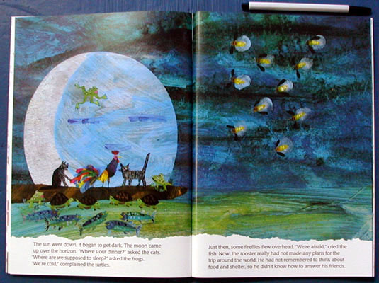 One fine morning, a rooster sets off to see the world. Soon he's joined by two cats, then three frogs, then four turtles, then five fish. But one group by one, his new friends decide to head home, leaving the rooster alone again -- and ready to return to his own comfortable home as well. Bold, colorful collage illustrations, a beguiling story, and a simple introduction to number sets, addition, and subtraction combine to make Rooster's Off to See the World a delight for Eric Carle's many young fans.