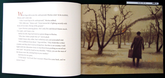 The story is all too familiar, unless you haven't been reading the papers or watching television news. A family hastens to escape their war-torn county, but before leaving, an older man leaves his fish bowl with the family. Little Marina names the fish Gleam and Glow, and her brother Viktor places the two beautiful goldfish in their pond in the hope that they may live a day or two more. The family escapes to the safety of a refugee camp and when the war ends, they return home. Sadly, it is only to find that all is destroyed, except that the beautiful fish have multiplied and filled the pond with shades of gold—adding some joy to their return home. As Eve Bunting remarked in one presentation "the saddest wars are civil wars." This story is sad but it ends on a bright note, and the closing picture is filled with the golden glow of the fish. The beautiful endpapers and cream-colored pages are a perfect complement as are the paintings by Sylvada, which early on are filled with dark colors to reflect the bleakness of war and then brighten as the people return home. This is a picture book that will also appeal to older readers.