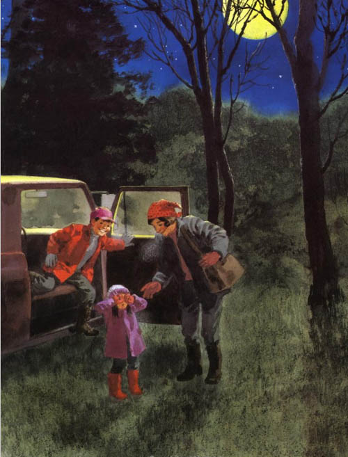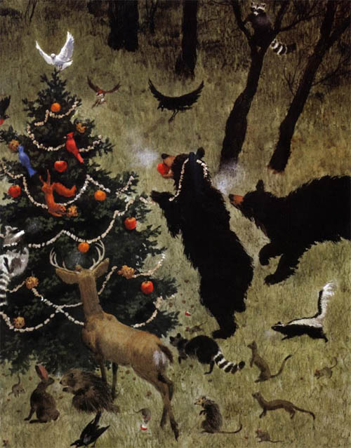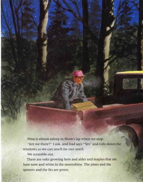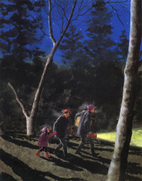 By moonlight in the quiet forest, a young boy and his family decorate their favorite tree with popcorn, apples, tangerines, and sunflower-seed balls as a gift for the animals of the woods.