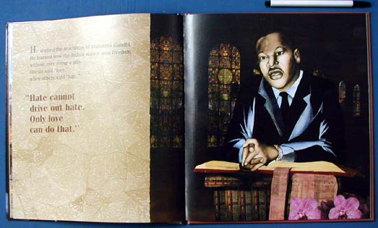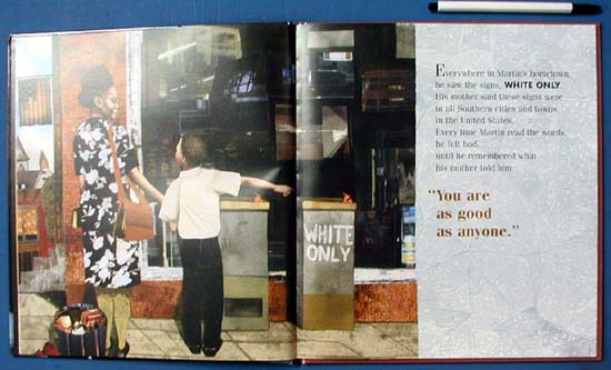 e-book biography provides an ideal introduction to this leader and his works. Juxtaposing original text with quotes from King's writing and speeches, Rappaport's (Escape from Slavery) narrative offers a pastiche of scenes from King's life, beginning with his childhood experience of seeing "White Only" signs sprinkled throughout his hometown. He questions his mother about their meaning, and she assures him, "You are as good as anyone." Listening to his father preach, the boy asserts that "When I grow up, I'm going to get big words, too." Rappaport also touches upon King's role in the Montgomery bus strike that followed Rosa Park's 1955 arrest for refusing to give up her seat to a white passenger and his subsequent efforts as a civil rights crusader. After briefly describing the circumstances of his death, the story concludes, quite abruptly, with the statement, "His big words are alive for us today." The author relies on her subject's own words, and his power, passion and pacifism shine through. Collier's (Uptown) striking watercolor and cut paper collage art feature closely focused, lifelike images of King and other individuals against an inventive montage of patterns and textures. The portraits of King exude his spiritual strength and peaceful visage. In the background of some scenes are intricate recreations of stained glass windows, which, Collier explains in an introductory note, he interprets as a metaphor for King's life. An elegant, understated pictorial biography. Ages 5-9.