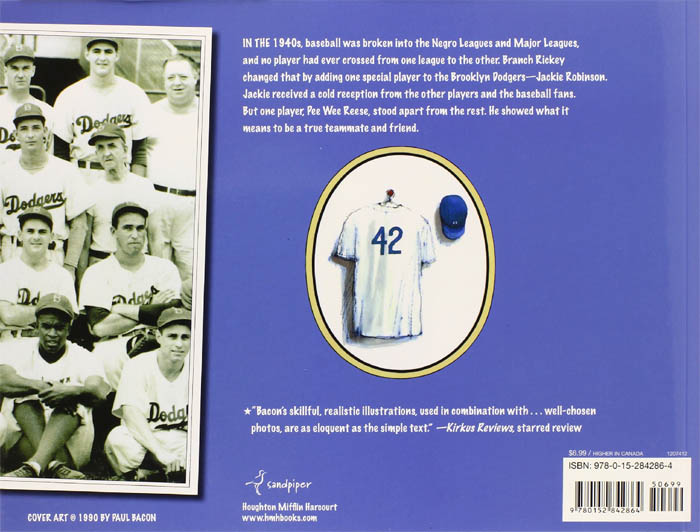 Describes the racial prejudice experienced by Jackie Robinson when he joined the Brooklyn Dodgers and became the first black player in Major League baseball and depicts the acceptance and support he received from his white teammate Pee Wee Reese.