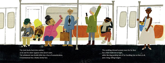 Milo is on a long subway ride with his older sister. To pass the time, he studies the faces around him and makes pictures of their lives. There's the whiskered man with the crossword puzzle; Milo imagines him playing solitaire in a cluttered apartment full of pets. There's the wedding-dressed woman with a little dog peeking out of her handbag; Milo imagines her in a grand cathedral ceremony. And then there's the boy in the suit with the bright white sneakers; Milo imagines him arriving home to a castle with a drawbridge and a butler. But when the boy in the suit gets off on the same stop as Milo--walking the same path, going to the exact same place--Milo realizes that you can't really know anyone just by looking at them.