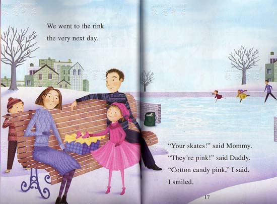 Pinkalicious receives white ice skates from her mother, and, using a "cotton candy pink" marker, she remakes them to better suit her tastes. After daydreaming about her graceful skating, she and her family visit the outdoor rink. Rather than gliding and spinning, poor Pinkalicious falls repeatedly. Her embarrassment is further compounded when the ink from her skates bleeds all over, leaving the ice covered in pink swirls and spots. Following an emotional meltdown, Pinkalicious receives a pep talk from Mom and a hand from Dad. She gives skating another go, this time with more positive results. Fans will be tickled pink with this adventure that's just right for beginning readers. |