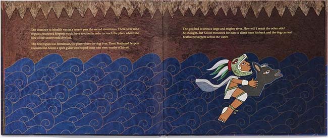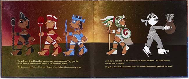 Long ago, the gods of Mesoamerica set out to create humans. They tried many times during each sun, or age. When all their attempts failed and the gods grew tired, only one did not give up: Quetzalcoatl--the Feathered Serpent. To continue, he first had to retrieve the sacred bones of creation guarded by Mictlantecuhtli, lord of the underworld. Gathering his staff, shield, cloak, and shell ornament for good luck, Feathered Serpent embarked on the dangerous quest to create humankind.