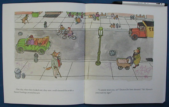 "Doctor De Soto is a mouse dentist who...operates a clinic open to all except animals threatening to mice. What to do, then, when a weeping and wailing fox shows up for treatment?. . .There is great wit and good fun in the illustrations."