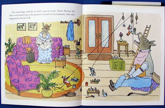 "Doctor De Soto, the dentist, did very good work." With the aid of his able assistant, Mrs. De Soto, he copes with the toothaches of animals large and small. His expertise is so great that his fortunate patients never feel any pain.