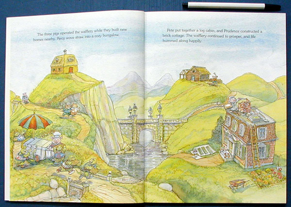 "Open up, Pork Chop! Or I'll huff and I'll puff and I'll flatten this dump!" Three little pigs are happily working away in their delicious family business -- making the best-tasting waffles in the world. Business is so good, in fact, that the three siblings can live comfortably in their very own homes -- Percy in his straw bungalow, Pete in his log cabin, and Prudence in her brick cottage. Then Tempesto, the meanest wolf on the block, shows up and wants more than waffles for breakfast -- he wants the three little pigs! Here is a zany retelling of a classic folktale from master storyteller Steven Kellogg.