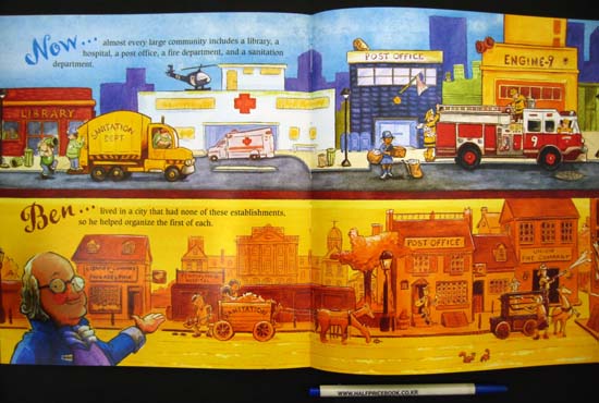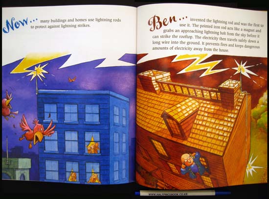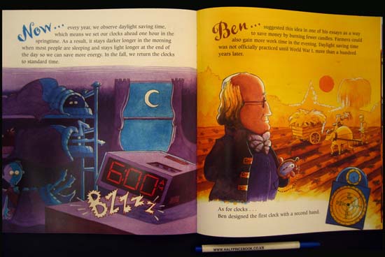 A clever, concise introduction to the contributions of this colorful colonial figure. The first spread depicts Franklin standing proudly by his family home with his wife and children smiling from within. His various occupations - writer, printer, diplomat, musician, humorist, postmaster, scientist, inventor, humanitarian - are written on the cobblestones beneath him. Next is a spread of a busy city street today, which challenges readers to guess which modern conveniences are owed to the subjects creativity. Subsequent spreads take a closer look at each invention from political cartoons, bifocals, electricity, lightning rod, and Franklin stove to daylight saving time and more. Each spread features a Now¡¦ description of a modern concept or convenience facing an early Ben¡¦ idea. Now¡¦every automobile has an odometer to measure the distance it travels. Ben¡¦invented the odometer when he was postmaster general so he could measure his postal routes. The fanciful final spread depicts a futuristic scene with flying-saucer vehicles and robot servers, which encourages youngsters to imagine how todays inventions will evolve in time. Engaging and humorous watercolor cartoons depict just how Franklins inventions were conceived and developed. The yellow mottled endpapers are filled with sketches of the inventions featured within. Both Alikis The Many Lives of Benjamin Franklin (S & S, 1988) and Rosalyn Schanzers How Ben Franklin Stole the Lightning (HarperCollins, 2003) offer more background and biographical information, though this lively offering is sure to inspire readers to learn more about its fascinating subject.