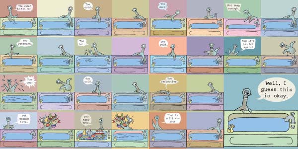 Somewhere between aspirations of locomotion, pining for a puppy, and scrambling to finish an activity book, the Pigeon got pretty dirty. Don't tell him that, though. In enduring Willems style, the Pigeon invites reader participation through questions, provocations, and wild gesticulations. With Pigeon evidently besmeared with soot, it's a classic case of denial: " ¡®Clean.' ¡®Dirty,' " remarks the Pigeon while making air quotes. "They're just words, right?" He then points the finger (or wing) at the accuser: "Maybe you need a bath! YEAH! When was the last time YOU had a bath?! Oh. That was pretty recently." After nervously smelling himself and discovering that even the flies hovering around him can't stand how stinky he is ("Take a bath, dude!" says one in retreat), the Pigeon finally relents. At the edge of the bathtub, though, he goes through his share of Goldilocks moments, which are presented in nearly 30 tiny sequential panels: "The water is too hot. Too cold. Too deep. Not deep enough." The Pigeon's cockeyed defiance and Willems's impeccable comedic timing are as fun and frisky as ever.