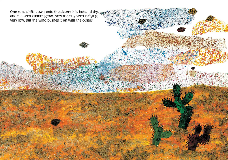 The fascinating cycle of plant growth is described in this board book by Eric Carle. It opens with autumn when the wind blows seeds into the air. Out of all the seeds that start the journey only a few make it to the ground in winter. Along the way some have been burned by the sun, fallen into the ocean to feed the fish, landed on a frozen mountain top or fallen onto the dry, inhospitable desert sands. It is not even safe on or in the ground. Birds feed on the seeds and mice nibble others that are in the ground. Finally, spring arrives and the seeds start to grow. Still there are dangers because weeds can grab all of the sun and rain that the little seeds need, but several manage to sprout. Once again all is not safe because a big human foot crushes one of the plants, and the flowers are so attractive that they are picked. During the summer one little seed survives and it grows into an enormous plant with the biggest flower that anyone had ever seen. Autumn comes and the entire cycle repeats. The collage illustrations are attractive and tell the story without needing to read the words. The board book version works from the standpoint of the illustrations, but there is a large amount of text in small type so the book's appeal may be to younger children with fairly long attention spans.