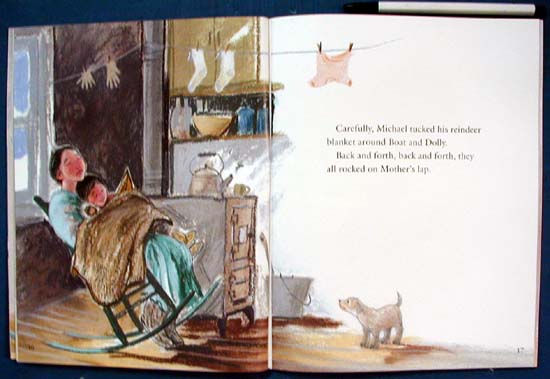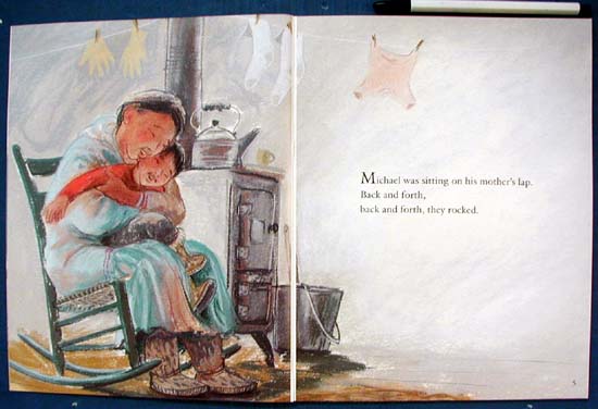 The story is familiar. Michael's favorite place to be is on Mother's lap while they rock back and forth in a rocking chair. He brings his favorite things--a dolly, a boat, his reindeer blanket, and a puppy. When baby wakes up crying and wants to join them, Michael claims there is no more room. Leave it to Mama, she finds room for everyone and everything. What adds special interest is the family--they are Inuits and the setting shows them in a cozy home. A brief glimpse out the window shows a snowy landscape and parka clad youngsters playing outside.