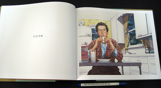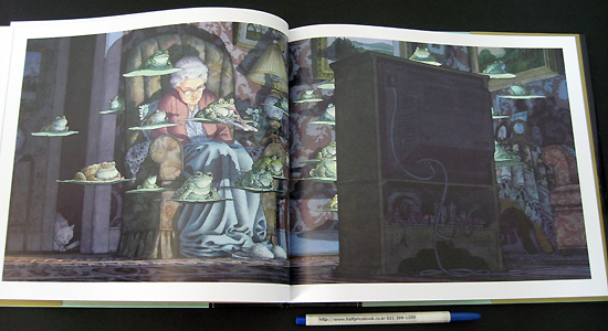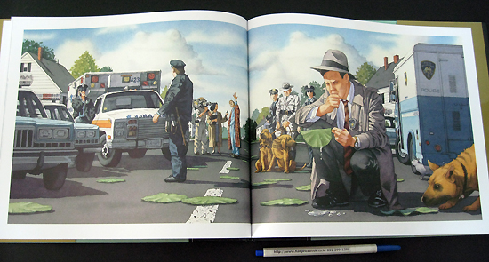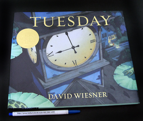 A surreal, almost wordless picture book shows the mysterious levitation of lily pads and frogs from a pond one Tuesday at dusk. The frogs soar around town until they fall to the ground at sunrise. Large, detailed watercolors use dramatic points of view and lighting effects and often show a humorous range of expressions. There is a forecast of further surprises to come on following Tuesdays. |