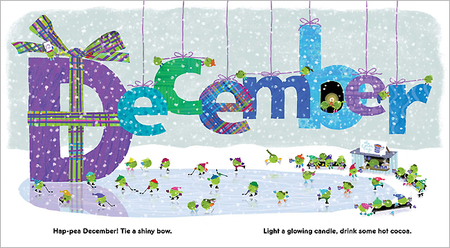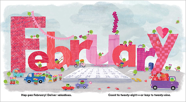 For each page spread, the peas get up to timely antics and activities-carrying valentines in February,