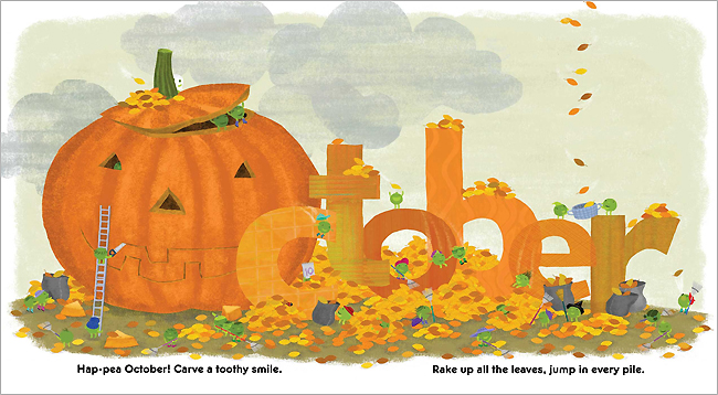 name, in oversize lettering, as numerous, peppy, diversely accessorized peas clamber all over the letters.