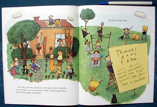 Aunt Fran grants Truman's birthday wish-an ant farm. When it arrives, he doesn't get ants-he has AUNTS! Truman embarks on a training program for his aunts, from tickle practice to headstands, roller-skating, storytelling, and hugs-skills the best of aunts need. When running out of room on his farm, Truman had the idea to give the aunts away, free to good homes. Children from all over come to choose an aunt. This is a delightful tale. The illustrations convey the feelings of joy and love we all should have for a very special aunt.