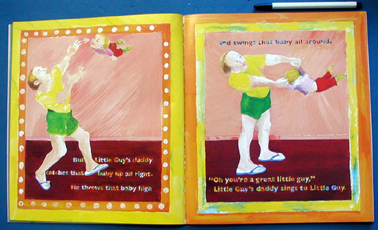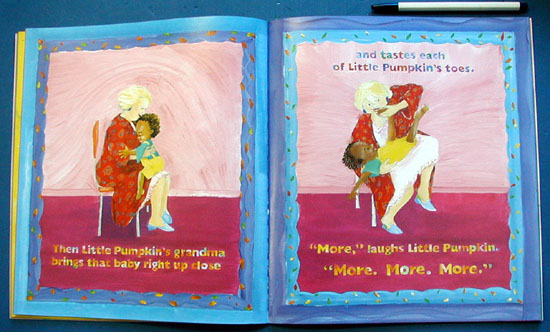 Gouache paintings illustrate the love between three children, Little Guy, Little Pumpkin and Little Bird, and the adults in their lives. Little Guy's daddy catches him up to swing him around and kiss his tummy - which makes him cry "more, more, more." Little Pumpkin's grandma loves his toes, and Little Bird's mama loves her sleepy little eyes. A visual celebration of family ties. Caldecott Honor Book. - Dr. Judy Rowen