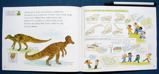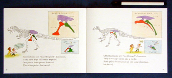 How can you tell dinosaurs apart? You can learn a lot about dinosaurs by looking at their bones. Some dinosaurs were very small; others were huge. Some had sharp, pointy teeth for eating meat; most plant-eaters had flat, dull teeth. Some dinosaurs' hipbones pointed forward, while other dinosaurs' hipbones pointed backward. There were dinosaurs with bony armor on their backs and others with deadly horns on their heads. Today scientists have divided dinosaurs into separate orders according to their special characteristics. It's easy to see that dinosaurs are different. |