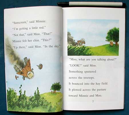 This laid back pair of bovines have another crazy adventure. This time a spaceship lands right in their pasture. It is a space creature who looks a lot like a potato, but he only has one eye. It appears that he is a UPS (Universal Package Service) deliveryman who lost his way while delivering Anti Bump Cream, something used to keep the planets from smashing into each other. Mr. UPS, or Speed, as he is named, needs to get a new spaceship and be off in 30 minutes. As it turns out, the fuel he needs is moo-juice (milk) and it has to have a very high fat content. Minnie is the one. The story is full of puns and references that will go right over the heads of kid readers, but will give the adult reader a few chuckles. Another "amoosing" adventure featuring this cow duo and their farmyard friends that kids will drink right up. 2002, HarperCollins,