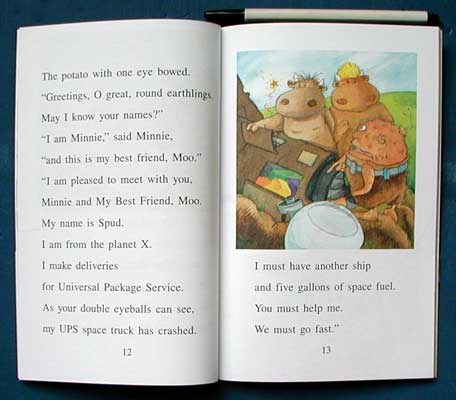Things on the farm get exciting when an alien, resembling a one-eyed potato, crash lands his spaceship in front of Minnie and Moo in this beginning reader by Denys Cazet (HarperCollins, 2002). Spud is from Planet X and finds himself in trouble when he stops for donuts instead of completing his important delivery for the Universal Package Service (UPS). With only a half hour left to get the Anti-Bump Cream delivered before the planets begin bumping into each other, it is up to Minnie and Moo to help Spud get on his way. The space fuel needed is milk, and Minnie comes to the rescue.