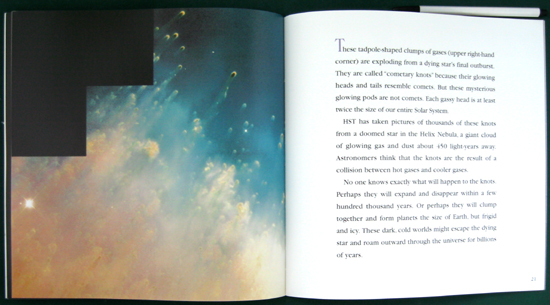 In this handsome and fascinating oversized book, Simon discusses the many new discoveries scientists have made because of the Hubble Space Telescope (HST), which has been orbiting Earth since April, 1990. On each spread, the large-print, easy-to-understand text is supported by a stunning, full-page color photograph. The author explains what discovery each image produced and how the information fits into our existing knowledge. His enthusiastic descriptions create vivid pictures in and of themselves.