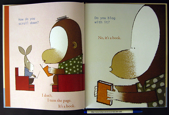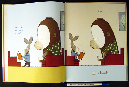 A small, neatly suited jackass, introduced on the title page, confronts a large, seated monkey, asking what he is holding. "It's a book," is the reply. Looking at his laptop the donkey explores this answer with a series of technological questions such as, "How do you scroll down?" and "Do you blog with it?" The monkey repeats the same simple answer. When asked where his mouse is, a lively mouse appears from under his hat. The questions about lighting, tweeting, and other computer-related actions all get the same answer from the monkey. When the monkey shows the jackass a page of the book, from Treasure Island, his reply at first is "too many letters," with some editing. It is only when the donkey begins to read the book that he is captivated. Then the monkey is off to the library for another book, with a parting shot from the mouse. The characters are created simply, in black outline, with solid color bodies and clothing. No context is needed beyond a couple of chairs and a wall clock. The wordless sequence of the donkey reading across the double page as the time passes on the clock above his head is particularly effective. The lesson of the value of an old fashioned book in this digital age comes through the humor. |