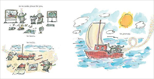 As an elephant couple embarks on their life together, thoughts of children are far away -- at first. But as the desire for a child grows, so do unexpected challenges. And it's only after thwarted plans and bitter disappointment that their deepest wish miraculously comes true. This "deceptively simple" story celebrates the profound joy of becoming a parent.