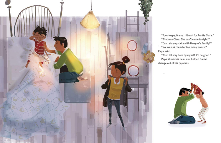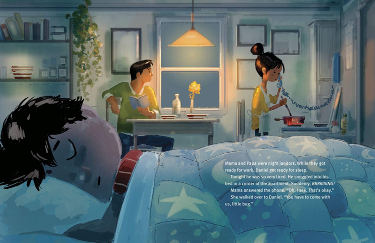 When the babysitter is unable to come, Daniel is woken out of bed and joins his parents as they head downtown for their jobs as nighttime office cleaners. But the story is about more than brooms, mops, and vacuums. Mama and Papa turn the deserted office building into a magnificent kingdom filled with paper. Then they weave a fantasy of dragons and kings to further engage their reluctant companion--and even encourage him to one day be the king of a paper kingdom.