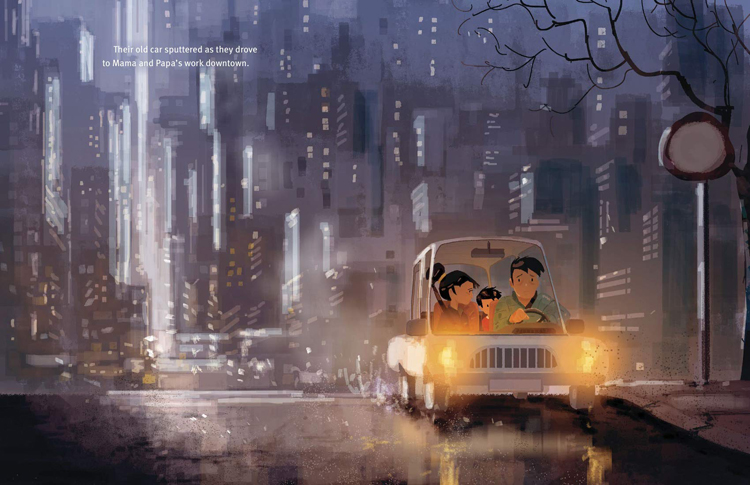 "In this entrancing picture book, a boy has to join his parents at work when the babysitter cancels. Helena Ku Rhee crafts a layered, loving picture book tribute to family and the sacrifices that parents make for their children's future...Pascal Campion's blurry lines and the watercolor-like shadows that follow the characters bring to mind the parallel world of kings and queens."