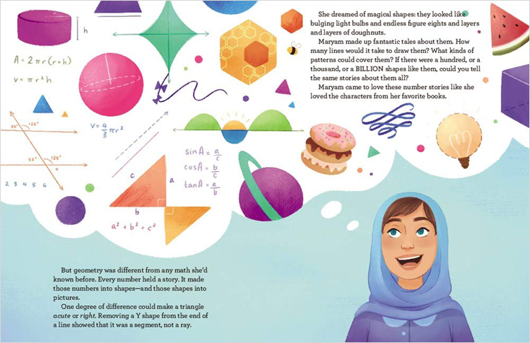 Maryam loved school, especially her classes in reading and writing. But she did not like math. Numbers were nowhere near as interesting as the bold, adventurous characters she found in books. Until Maryam unexpectedly discovered a new genre of storytelling: In geometry, numbers became shapes, each with its own fascinating personality-making every equation a brilliant story waiting to be told.