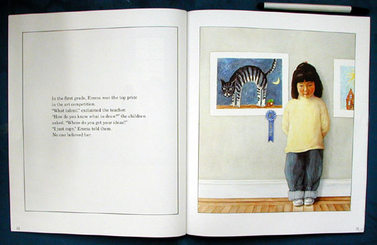 As a small child, Emma has two noteworthy practices: she stares for long periods at the fuzzy white rug she has had since birth, and she spends quite a bit of time drawing intently. When she enters school and garners many prizes for her artwork, it becomes clear that the seemingly blank rug is the source of her inspiration. Knowing more than Emma's mother, youngsters will wish they could intervene when she decides, soon after Emma is feted as the winner of a citywide art competition, that the now-dingy rug needs a washing and throws it into the machine. Caldecott Medalist Say's (Grandfather's Journey) deftly understated tale leaves ample room for readers' own interpretations. Yet it is his superb visual images, which have the semblance of faultlessly composed photographs, that make the most indelible mark here. As he has so affectingly accomplished with the characters in his previous works, Say fills Emma's face with abundant expression; her moments of anguish when she thinks she has lost the source of her art and her subsequent despondency seem wrenchingly real. Equally convincing is the child's tentative hopefulness when, in the book's most innovative picture, she spies the faces of many intriguing creatures (which Say hides playfully around her) begging to be drawn. An impressive creation, to be appreciated on many levels. All ages.