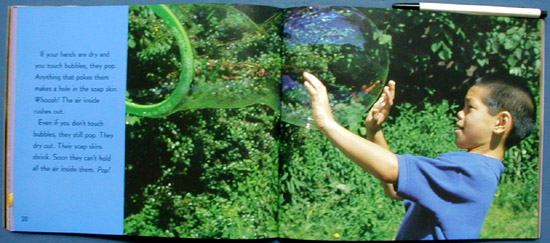 Bubbles here, bubbles there, bubbles, bubbles, bubbles everywhere-big ones, small ones, single ones, or in a stream. Some float gently, while some pop immediately. No matter what they are made of or how or where they are produced, they are always round, never square. A simple, accurate text that is also fun to read explains these facts. Delightful color photographs of charming children making bubbles and of bubbles floating freely reinforce and extend the text. Children will want to participate themselves to test the data. The book includes a page of experiments and a recipe for making a solution (which may need some adult help to prepare). This is science learning at its best.