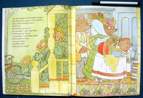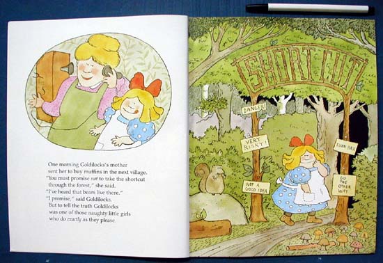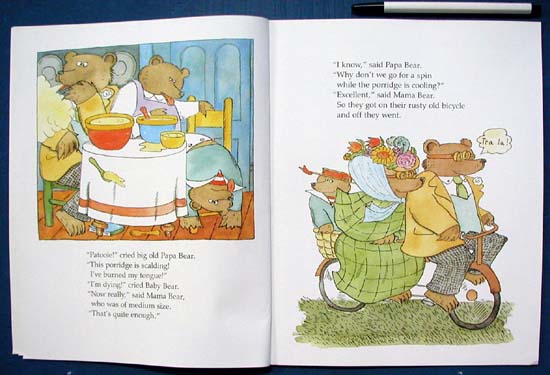 A loopy contemporary humor marks Marshall's work. His writing has the syntax and phrasing and his illustrations the telling details that create a modern context for even the most traditional fairy tales. Goldilocks and the Three Bears opens thus: 'Once there was a little girl called Goldilocks. "What a sweet child," said someone new in town. "That's what you think," said a neighbor.' The accompanying illustration shows a blonde, curly-hair, fiercely scowling little girl about to splash water over three sweetly sleeping cats. My favorite illustration is of Goldilocks in Baby Bear's bed in the quintessential child's room chaos of heaped and scattered bats, toys, books, and clothes. James Marshall retells the story of Goldilocks, an adventuresome little girl, who takes a journey through the forbidden forest and comes upon the home of three bears, who are out on a bike ride. The bears return home to discover a little visitor sleeping in baby bear's bed. This Caldecott Honor Book is wonderfully illustrated with delightful detail and humor.