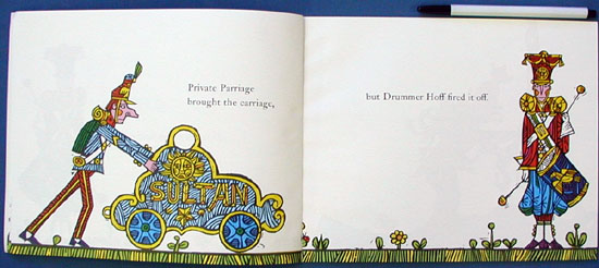 A cannon is assembled when Corporal Farrell provides the barrel, Sergeant Chowder brings the powder, General Border barks the order, and last of all, Drummer Hoff fires off the cannon." |