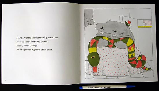 George and Martha, the two hippos, return with three lighthearted, amusing, short stories. In an attempt to impress Martha, George brags how he was an outstanding jumper and notorious pirate, however, that does little to impress Martha until he mentions that he was a well-known snake charmer. Martha has the last word on the topic, and George does find out that he does have some bragging rights as the story comes to an end with an interesting twist. In the second story, Martha is deeply absorbed while observing fleas in her laboratory. The flea scientist finds her work on the itchy side. George helps his friend only to find out what her next scientific topic of study will be. In the final story, read to find out how Martha gets George to go on a picnic when he prefers to stay in bed. The illustrations provide moderate support, and the story moves along on the dialogue of George and Martha. Readers may need support understanding the inferences in the story and the twist of the endings. Fans of the "George and Martha" series will continue to love the humor, and those who are new to George and Martha stories will find additional books to enjoy with laughter. |