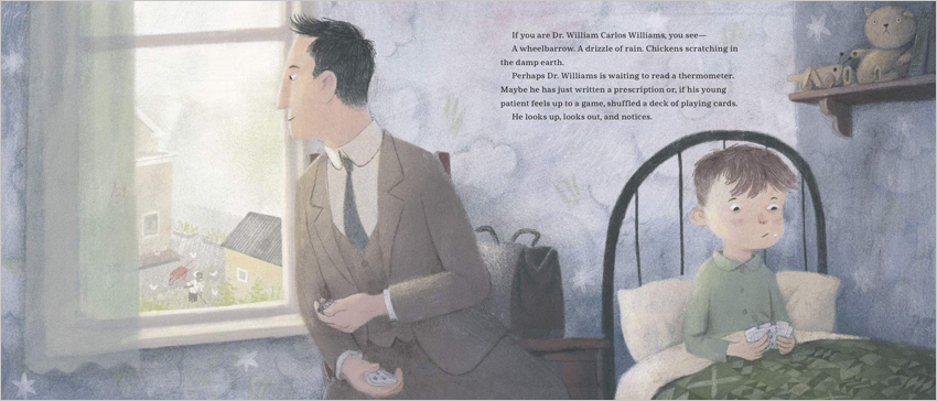 "Look out the window. What do you see? If you are Dr. William Carlos Williams, you see a wheelbarrow. A drizzle of rain. Chickens scratching in the damp earth." The wheelbarrow belongs to Thaddeus Marshall, a street vendor, who every day goes to work selling vegetables on the streets of Rutherford, New Jersey. That simple action inspires poet and doctor Williams to pick up some of his own tools--a pen and paper--and write his most famous poem.