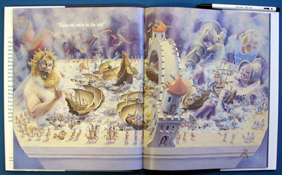 Audrey and Don Wood seem to enjoy their work. In their book 'The NappingHouse' {BRD 1985} and in this latest creation they express an exuberance thatis quite infectious. . . . The bathtub scenes are clearly the most fun, so that when the Page, as hero, puts an end to the merriment (and does it in a rather lackluster manner)--we're disappointed. Instead of cheering the Page for his resourcefulness, we resent him. Another element disturbed me. All the characters are painted to look as if they are overacting. In a farce, even a broad farce, such elaboration is deadly. Combined with language like 'glub, glub, glub' or 'yum, yum, yum' one senses a failure to be truthful to the lighthearted nature of the story.