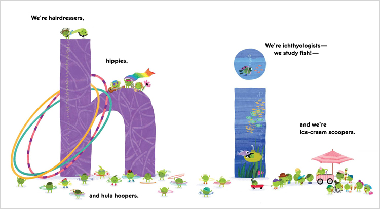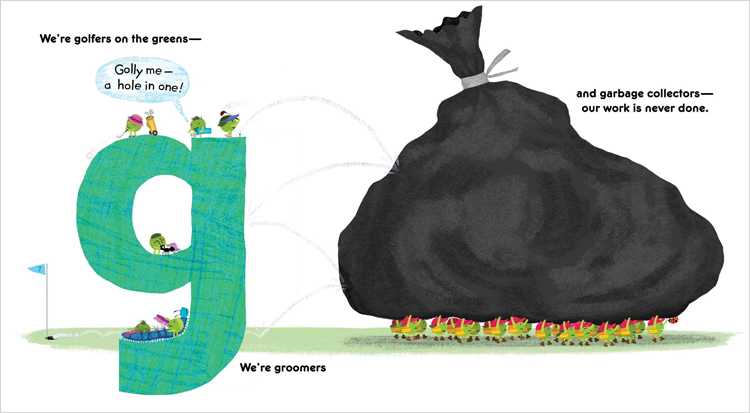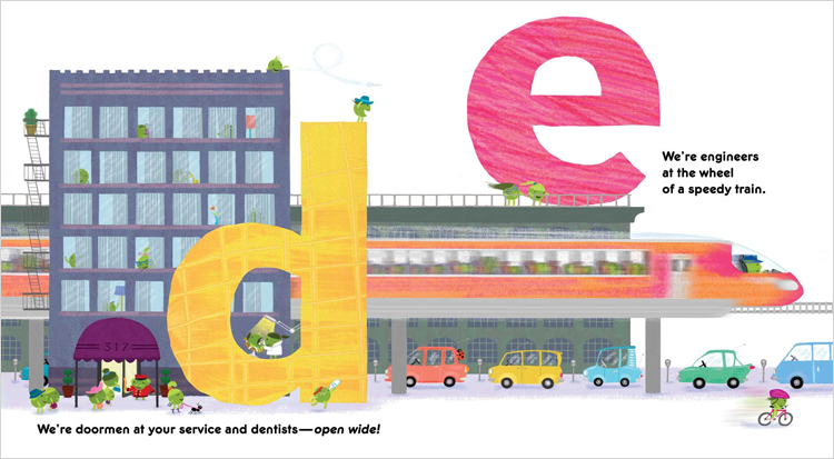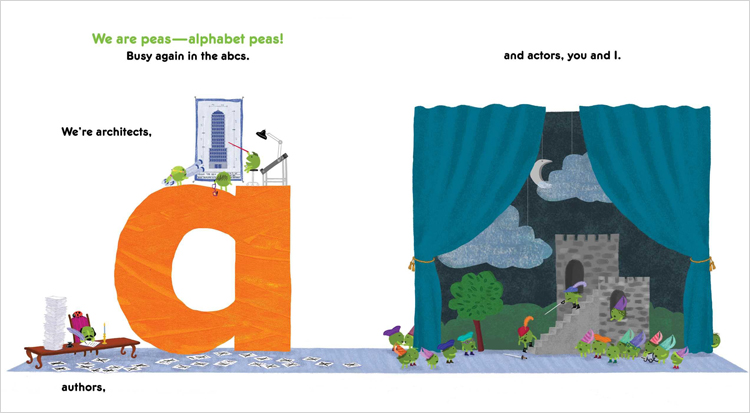 Baker¡¯s industrious pea-ple are back for a fifth tour, this time delivering an A-to-Z look at work and play. Colorful, digitally textured lowercase letters loom large against white space, cleverly integrated into the action. Firefighters use a ladder truck to train a hose on a small fire high atop the letter F. An S - strapped to the roof of a school bus filled with book-toting students - sports a row of saluting soldiers up on top. Among the standard community helpers, from architects to window washers, Baker inserts a bit of whimsy: there are pirates, a queen, and five ¡°X-Peas¡± exhibiting their superpowers. There¡¯s some deliberate, anthropomorphized diversity: a violinist is female (or at least has a ponytail) and uses a wheelchair; one soldier appears female (with hair in a bun), and most work crews have some female peas (so to speak)....there¡¯s fun for kids to discover here - from the vegetable horde¡¯s teeming activities to a ladybug that appears on each double-page spread... |