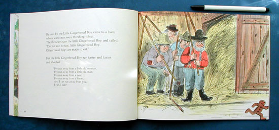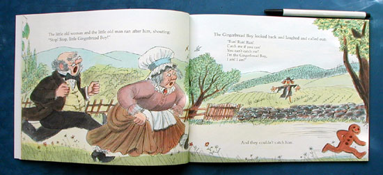 ¡°The classic tale of the old couple, with no children of their own, who bake a gingerbread boy to keep them company. Just as the little old woman is about to take him from the oven, he slips away and runs out the door past a cow, a horse, a group of threshers, mowers, etc. All follow in hot pursuit until the gingerbread boy meets up with a wily fox, and ¡®at last and at last he went the way of every single gingerbread boy that ever came out of an oven . . . He was all gone!¡¯ A wonderfully frenetic cross-country chase is depicted in Galdone¡¯s broadly humorous color wash drawings. Of the eight editions of this well-known story now in print, this hilarious version is the most delectable.¡±