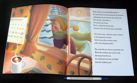 The beginning of winter is marked by the solstice, the shortest day of the year. Long ago, people grew afraid when each day had fewer hours of sunshine than the day before. Over time, they realized that one day each year the sun started moving toward them again. In lyrical prose and cozy illustrations, this book explains what the winter solstice is and how it has been observed by various cultures throughout history. Many contemporary holiday traditions were borrowed from ancient solstice celebrations.