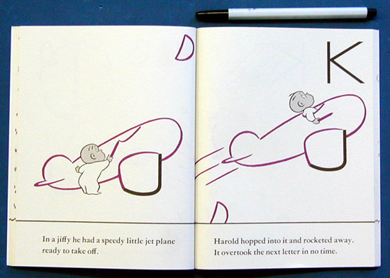 Taking along his purple crayon, Harold journeys from A to Z, each letter generating a picture from which the word becomes part of an uninterrupted story.