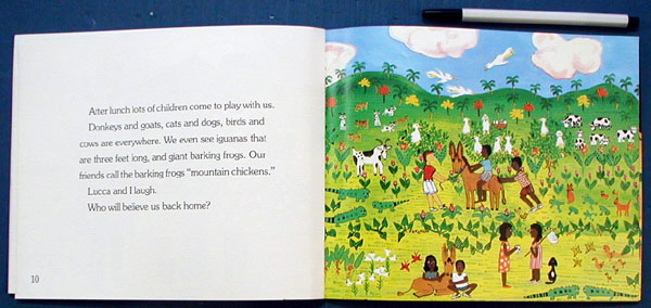My best friend, Lucca, and I are going to visit the little Caribbean island where I was born. It has three-foot-long iguanas and barking frogs; guavas, christophines, mangoes, orange pawpaws, and other juicy fruits; calypso and reggae music; and even its own volcano. It's good to be home again!
