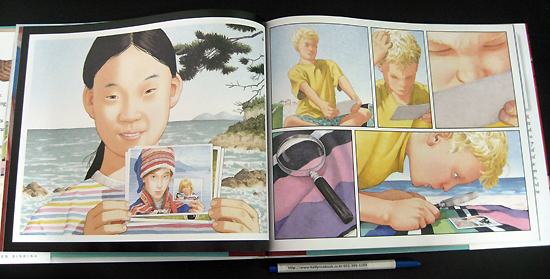 As in his Caldecott Medal Book Tuesday (1991), Wiesner offers another exceptional, wordless picture book that finds wild magic in quiet, everyday settings. At the seaside, a boy holds a magnifying glass up to a flailing hermit crab; binoculars and a microscope lay nearby. The array of lenses signals the shifting viewpoints to come, and in the following panels, the boy discovers an old-fashioned camera, film intact. A trip to the photo store produces astonishing pictures: an octopus in an armchair holding story hour in a deep-sea parlor; tiny, green alien tourists peering at sea horses. There are portraits of children around the world and through the ages, each child holding another child's photo. After snapping his own image, the boy returns the camera to the sea, where it's carried on a journey to another child. Children may initially puzzle, along with the boy, over the mechanics of the camera and the connections between the photographed portraits. When closely observed, however, the masterful watercolors and ingeniously layered perspectives create a clear narrative, and viewers will eagerly fill in the story's wordless spaces with their own imagined story lines. Like Chris Van Allsburg's books and Wiesner's previous works, this visual wonder invites us to rethink how and what we see, out in the world and in our mind's eye. |