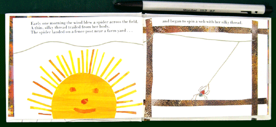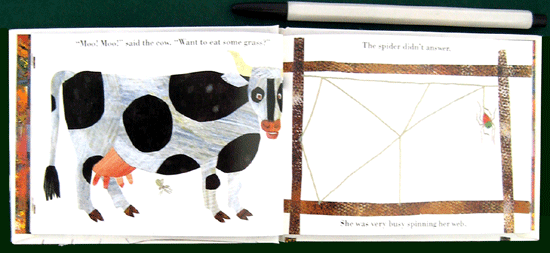 The farm animals try to divert a busy little spider from spinning her web, but she persists and produces a thing of both beauty and usefulness. The pictures may be felt as well as seen