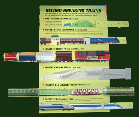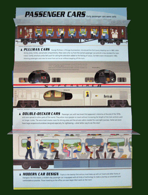 With pop-up effects that, appropriately enough, tend to be long, narrow, and placed in parallel tracks, this history of railroading opens with outside and inside views of a small steam locomotive and closes with a full-spread, double-tiered train station. In between, the book covers methods of propulsion, the development of passenger cars, speed and other records, tunnels, bridges, and other engineering feats. A mix of boldface titles and brief remarks, the text is printed both between and on or under moving parts-the latter adding another element of discovery for eager flap-lifters and tab-pullers. Crowther simplifies technological details in his neat, brightly colored collage illustrations, so this outing will draw a younger audience of trainiacs than the likes of Fiona Conboy's Ten Terrific Trains. |