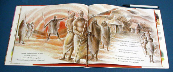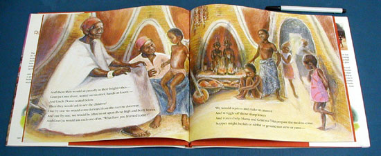 Tos is an actual village, on the side of an inactive volcano in Central Africa. It is the village in the book's title, where women dwell in round thatch-roofed huts and men live in square ones. This book tells the story of how the houses were so designated, in the aftermath of the volcano releasing its full fury on the village. Grifalconi effortlessly embroiders the customs of the village into her melodious narration. The author, who has illustrated over 50 children's books, including Lucille Clifton's Everett Anderson books, here illustrates her own tale, told to her by a young girl who grew up in Tos. The resting purple volcano, suddenly erupting into orange; the eerie orange sun; the villagers covered with ash; the purple and orange skies; the dense, lush junglesall are captured beautifully by Grifalconi's art.