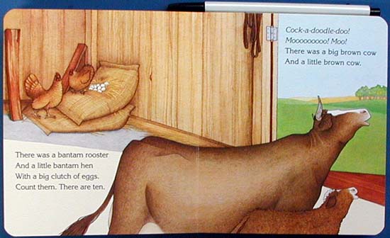 A charming story about a day in the barnyard features cows, roosters, horses, goats, a pink piglet, and all the sounds that they make, in a sturdy board book format. |