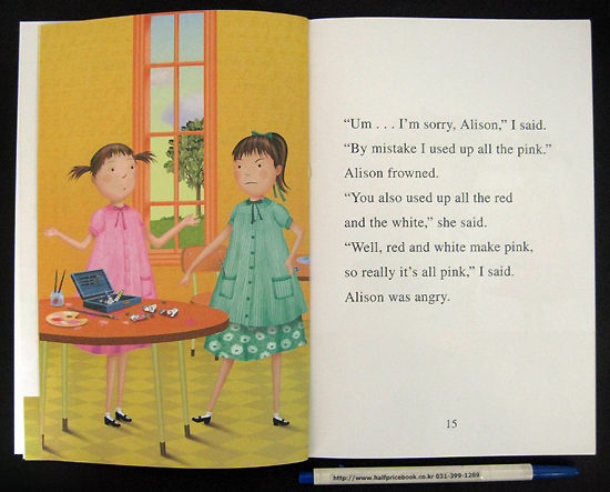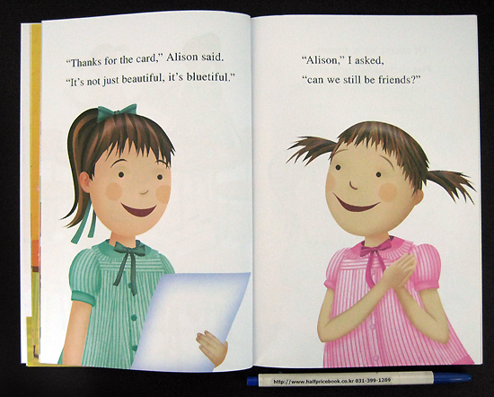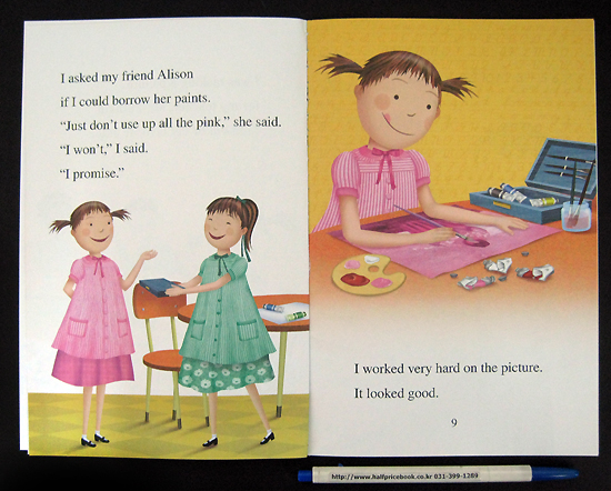 The popular Pinkalicious gets herself into trouble with her best friend. During art class, she borrows her friend Alsion's paints and her friends specifically asks her not to use up all the pink paint, but it happens because that is really Pinkalicious' favorite color. The result is that Alison is angry and leaves in a huff. What can Pinkalicious do to make up with her friend? As a first step Pinkalicious makes a card for Alison to apologize and then asks her if they can still be friends. Alison is gracious and accepts the peace offering and the friends agree to a weekend play date. There is one more thing that Pinkalicious does which leads to a celebration of shared ice cream. Note the different pink flavors on the ice cream parlor menu board. It is a treacley tale but it does have a positive message about friendship and the need to make amends and to forgive. A Level one book in the "I Can Read!" series.
